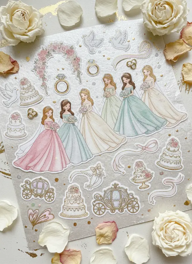 Ép Kim/Ép Nhũ: Tạo hiệu ứng lấp lánh ở vương miện, váy áo, giúp sticker trông cao cấp hơn hẳn.