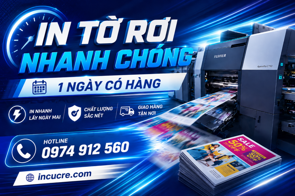 In tờ rơi số lượng ít tầm 100 – 200 sẽ lấy sau 60 – 120 phút kể từ lúc ký duyệt mẫu. Còn in số lượng lớn sau 24h là có hàng.